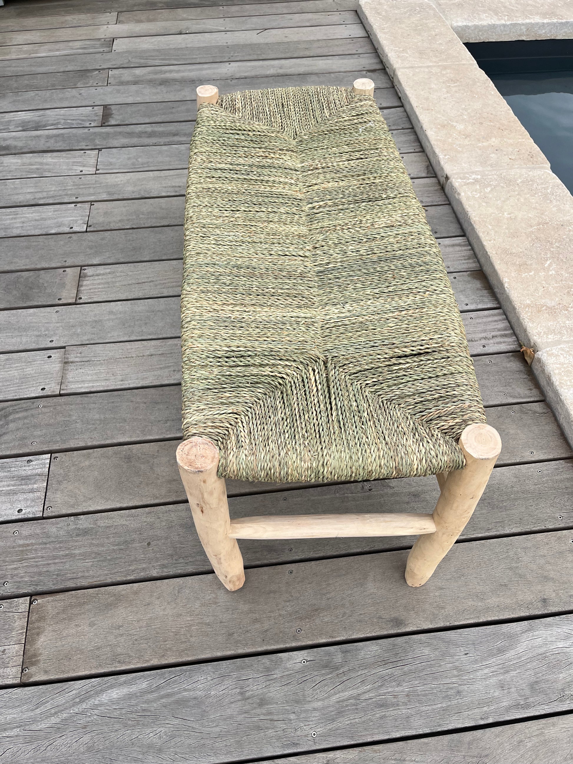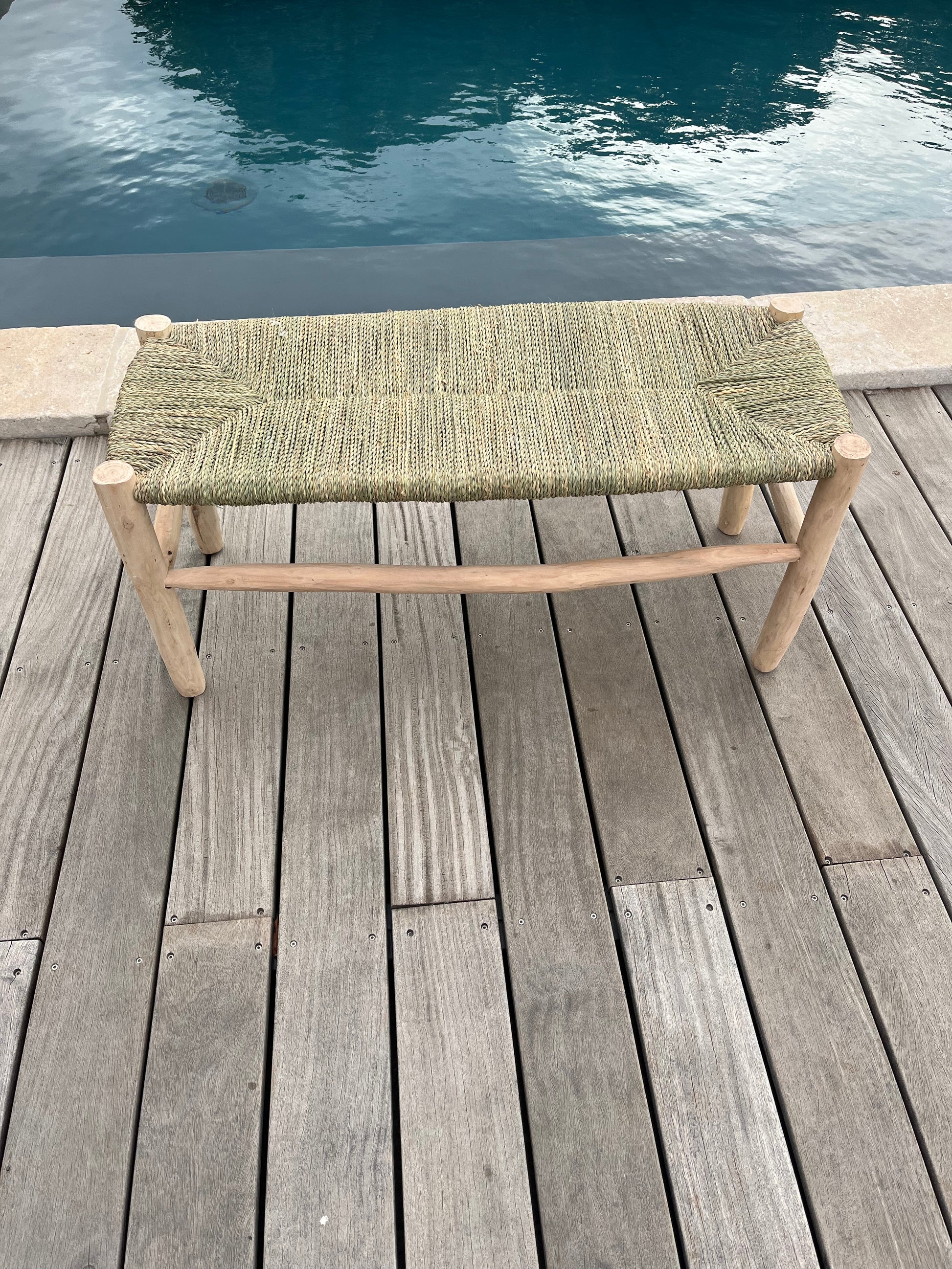 Banc d'appoint en bois d'eucalyptus et osier. Peut également être utilisé en bout de lit. La taille L est très pratique avec ses dimensions qui lui permettent d'accueillir deux personnes. La taille M accueille une personne de manière très confortable.