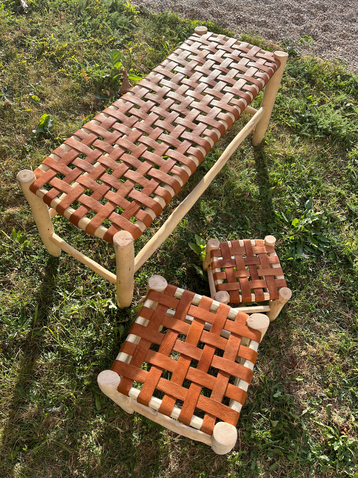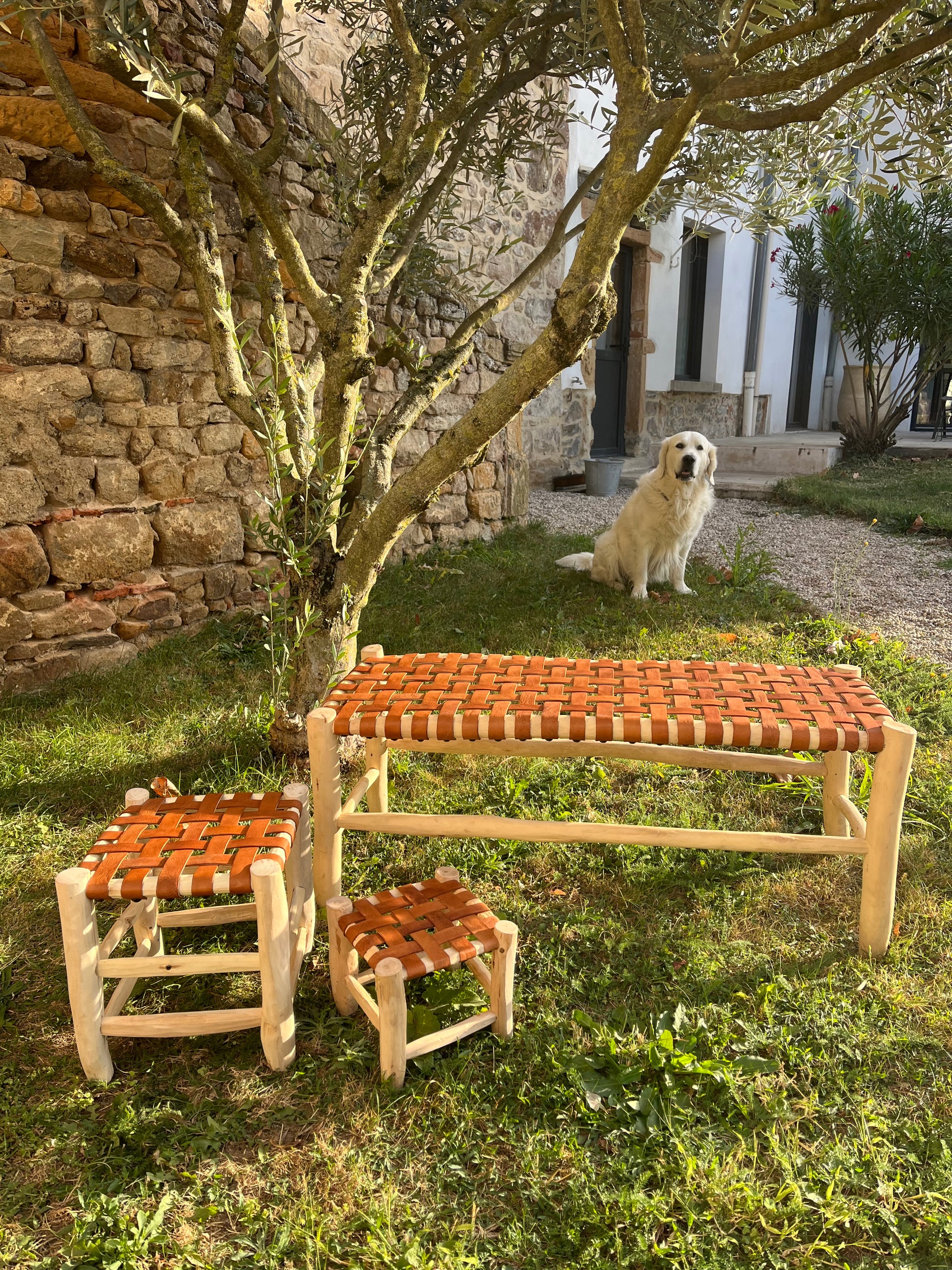 Banc et tabouret d'appoint en bois d'eucalyptus et cuir tressé. Le banc peut être également utilisé en bout de lit. Il est très pratique avec ses dimensions qui lui permettent d'accueillir deux personnes. Les tabourets sont des petites pièces très harmonieuses, associez la taille S et M pour décorer un petit coin de pièce et pour servir de siège d'appoint.