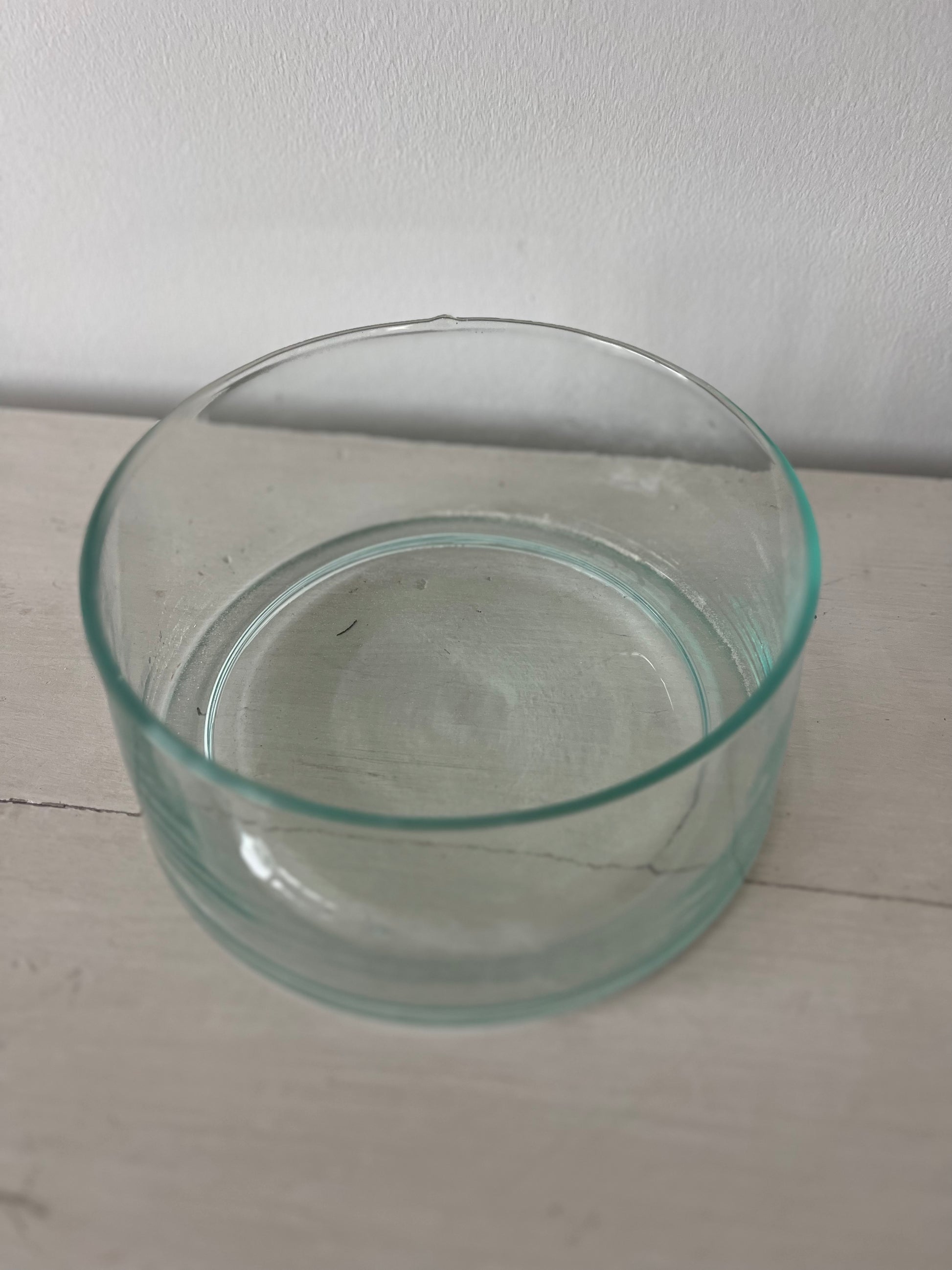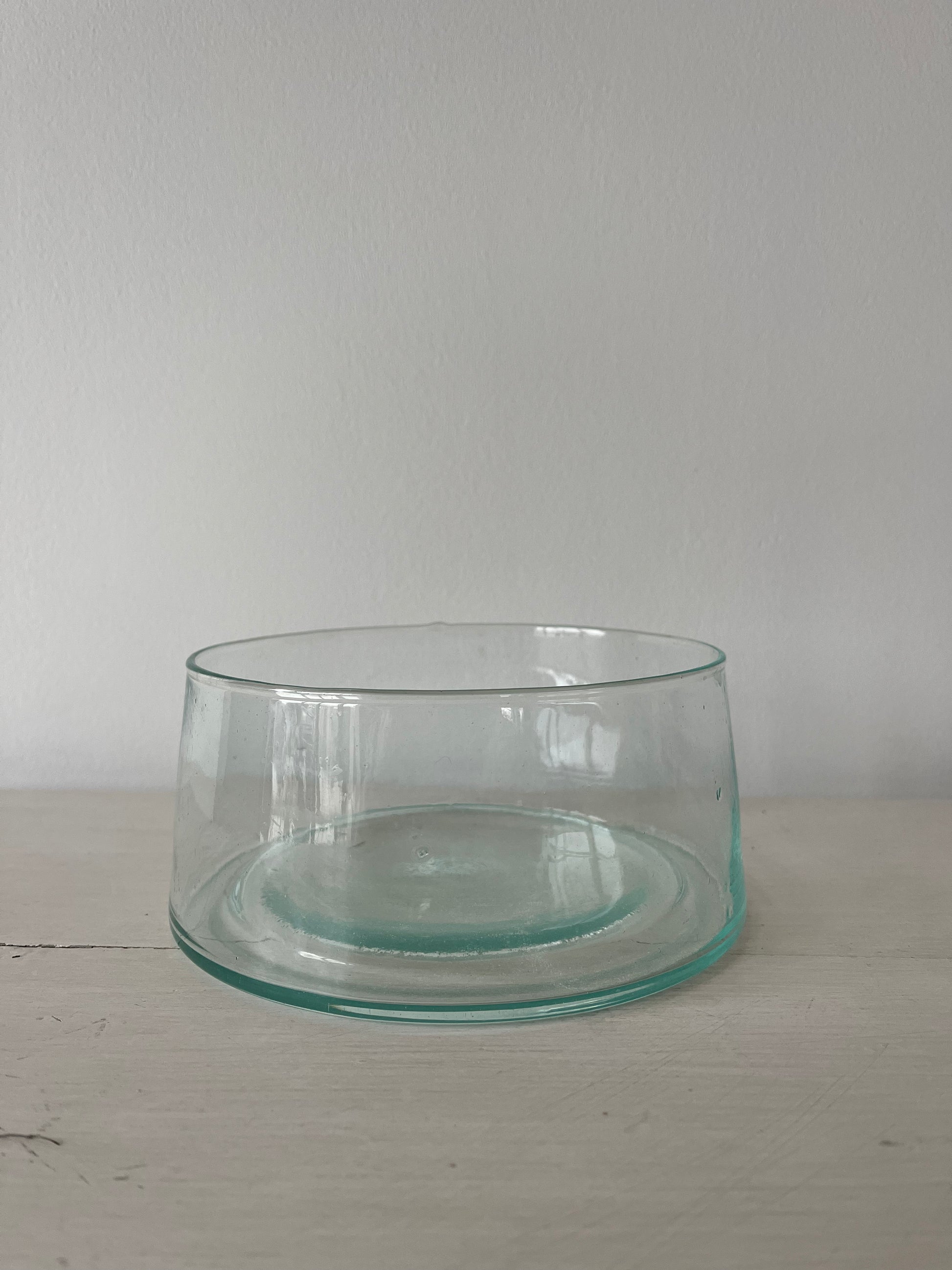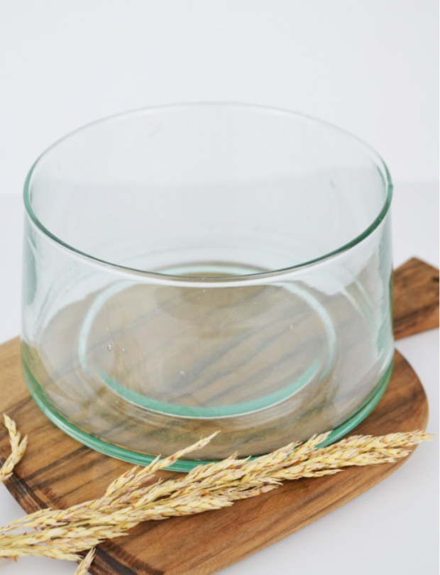 Plat creux en verre soufflé à la bouche à partir de verre naturel ou recyclé.