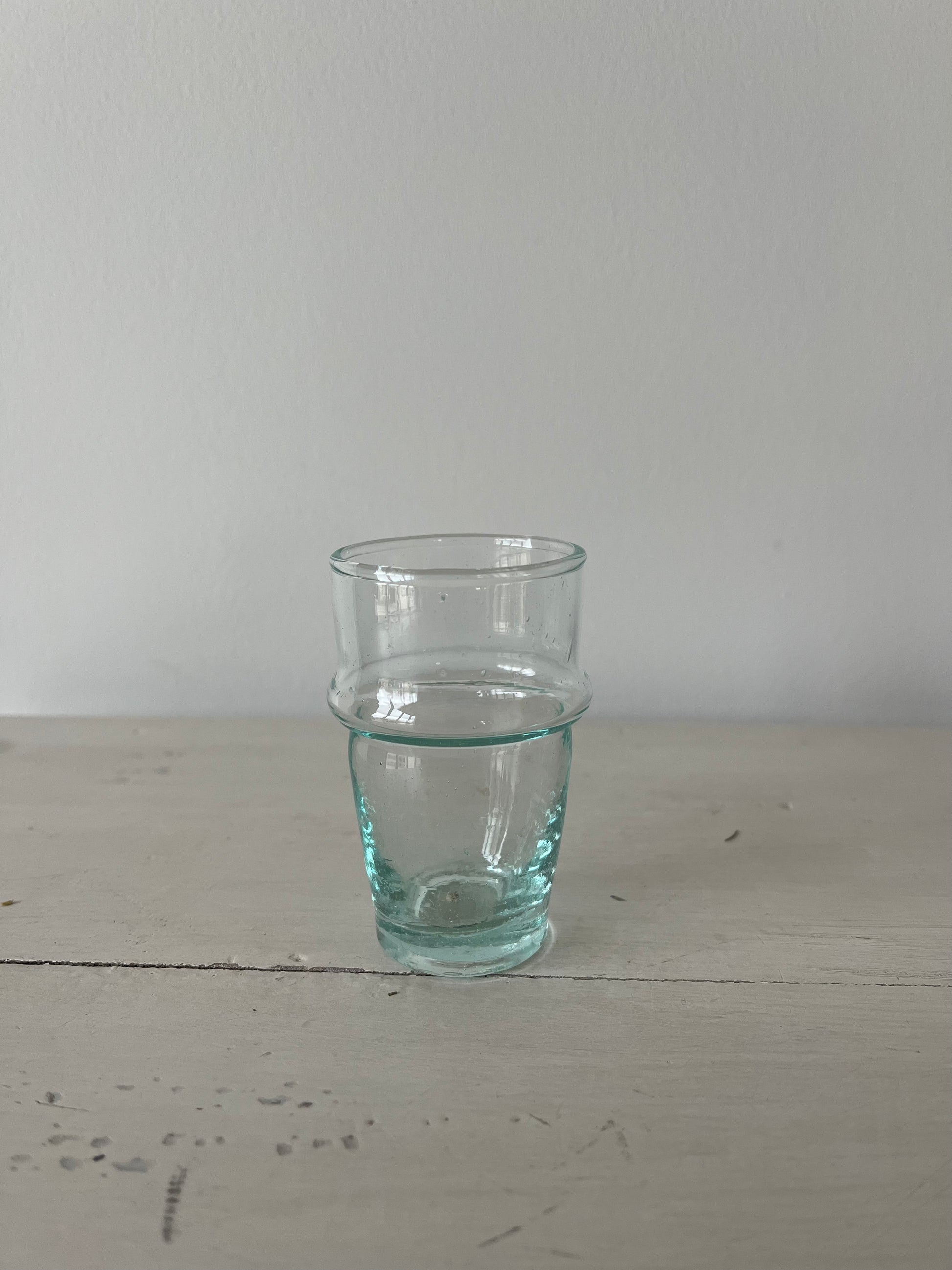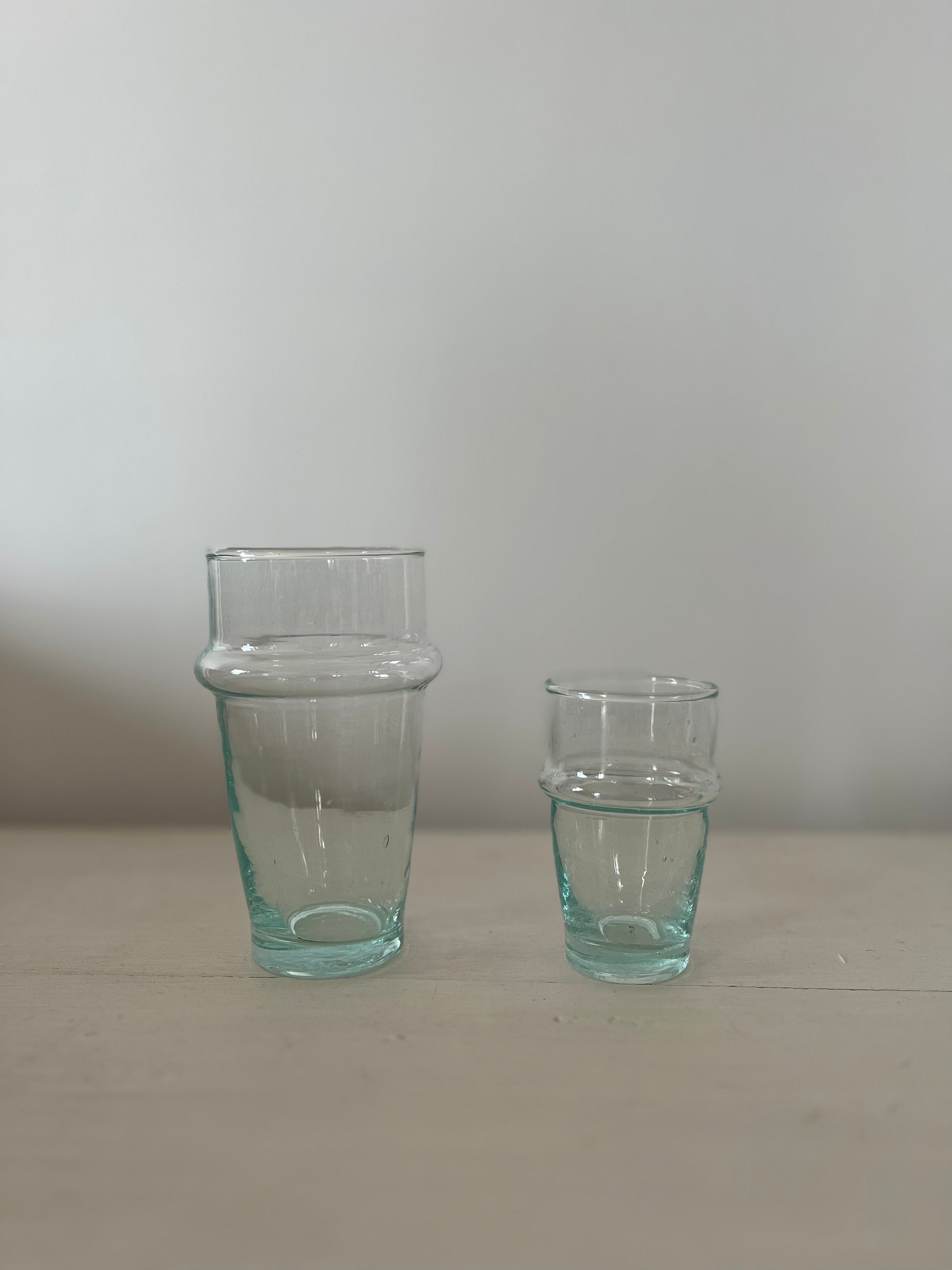 Verres de table soufflés à la bouche à partir de verre naturel ou recyclé.