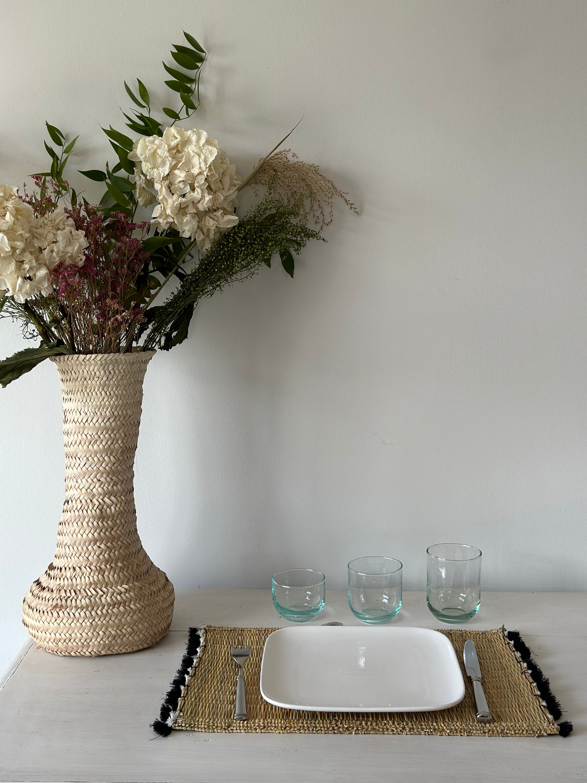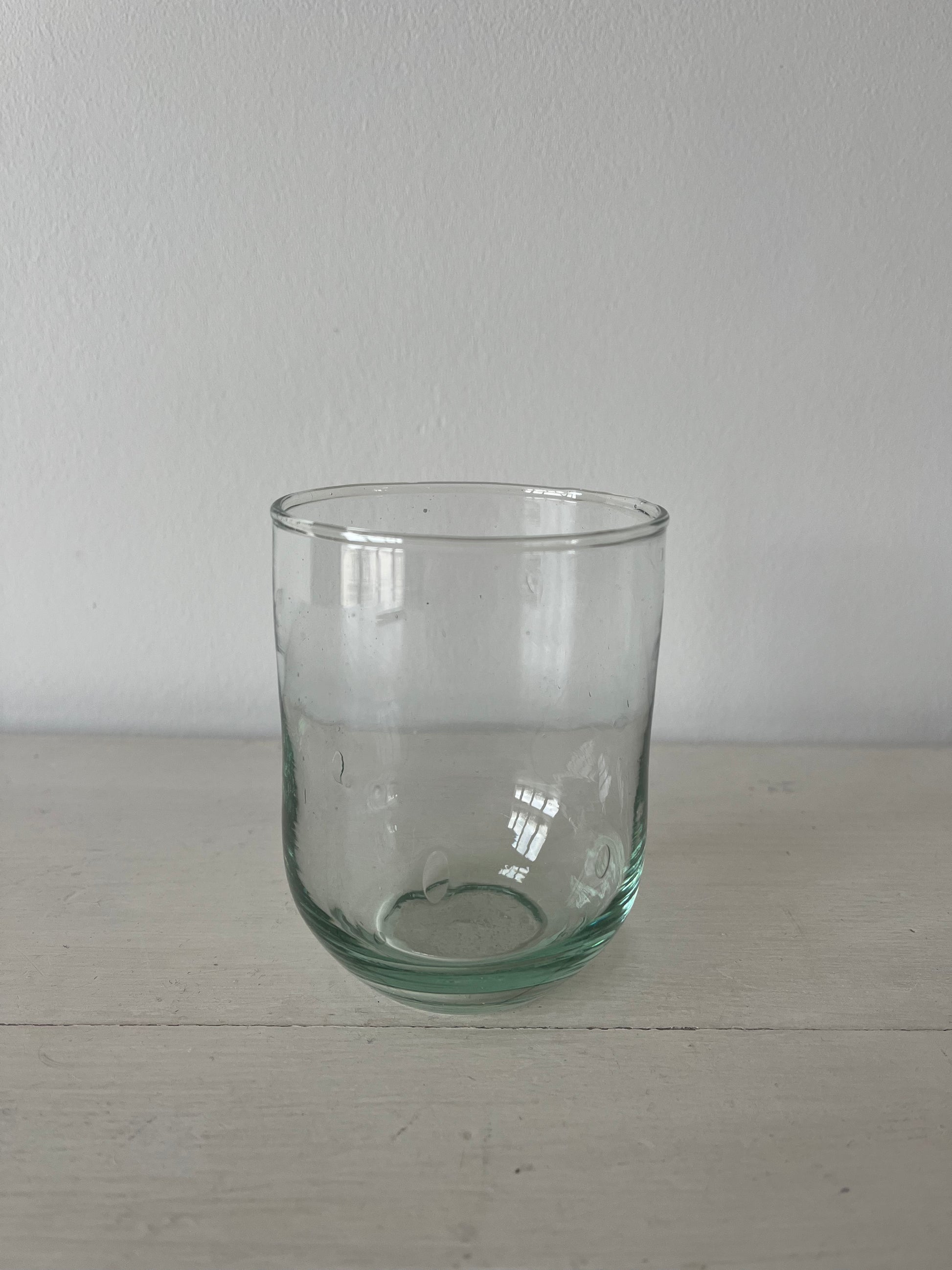 Verres de table soufflés à la bouche à partir de verre naturel ou recyclé.