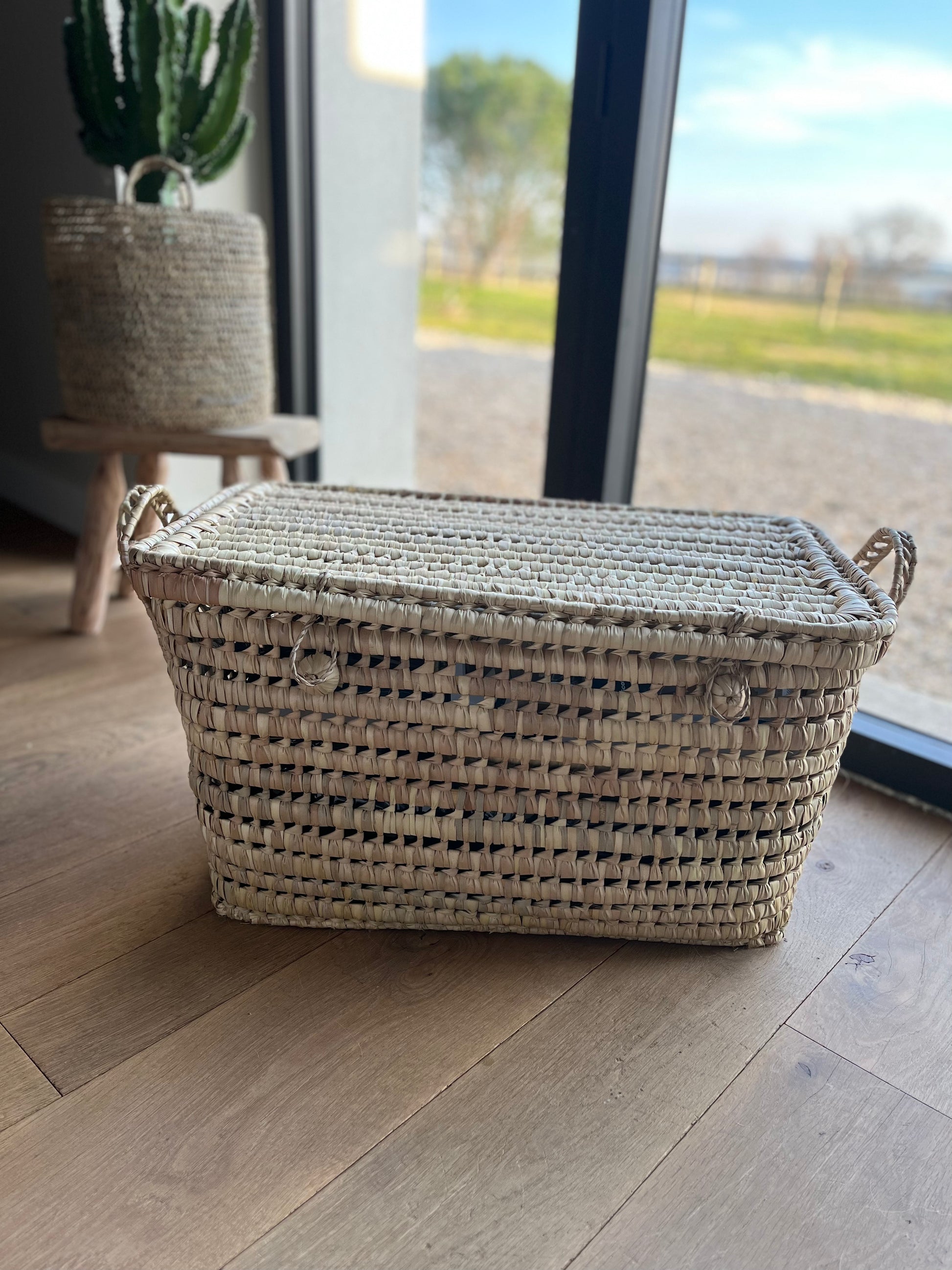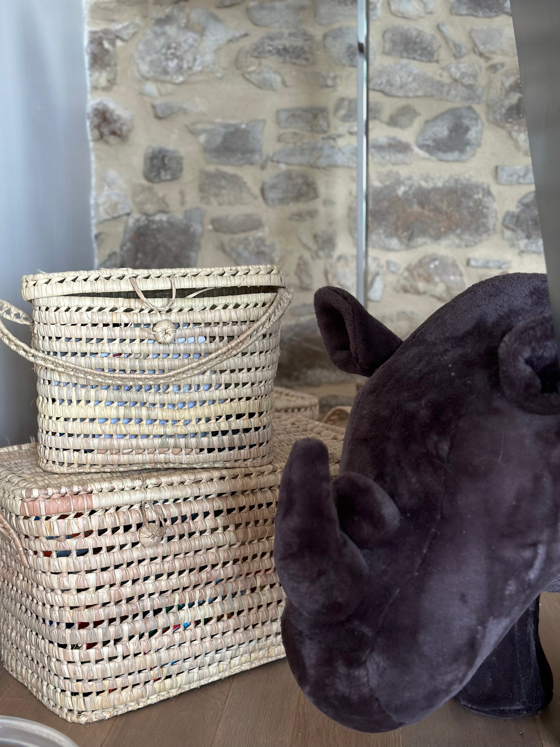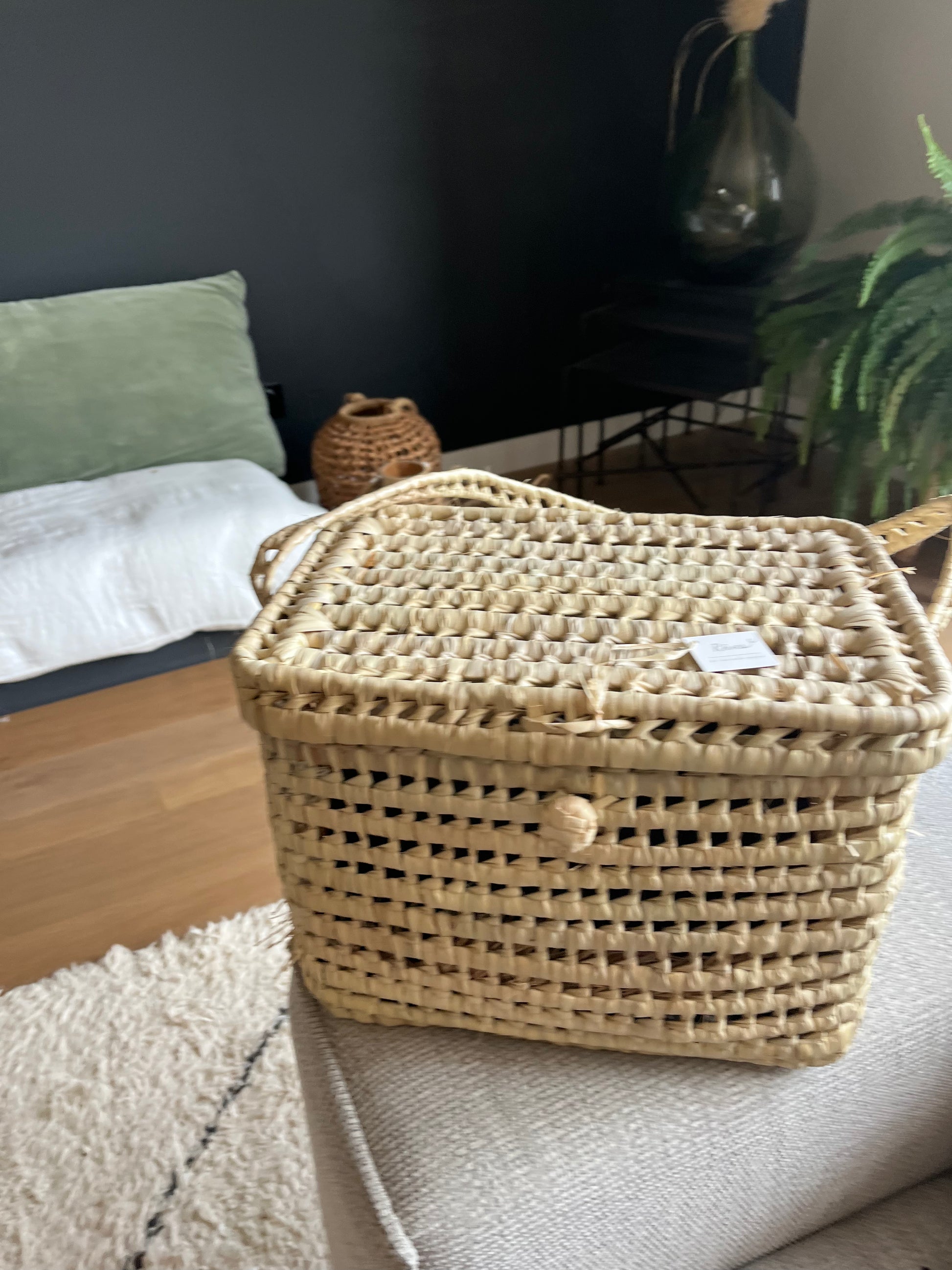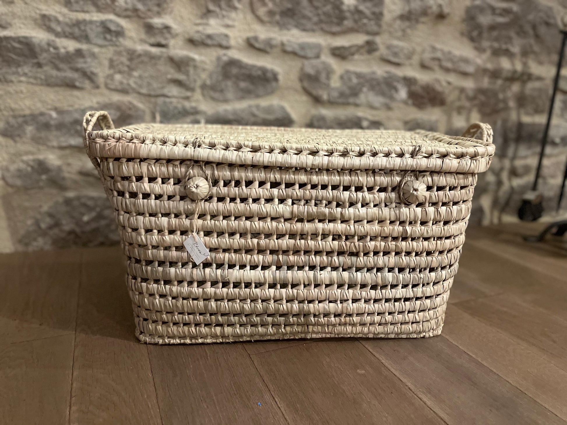 Magnifiques malles en feuilles de palmier naturelles fabriquées par nos artisans marocains. Décoratives et très pratiques pour y ranger toute sorte de petits objets. Le modèle est différent selon les tailles, spécifiquement au niveau des anses.