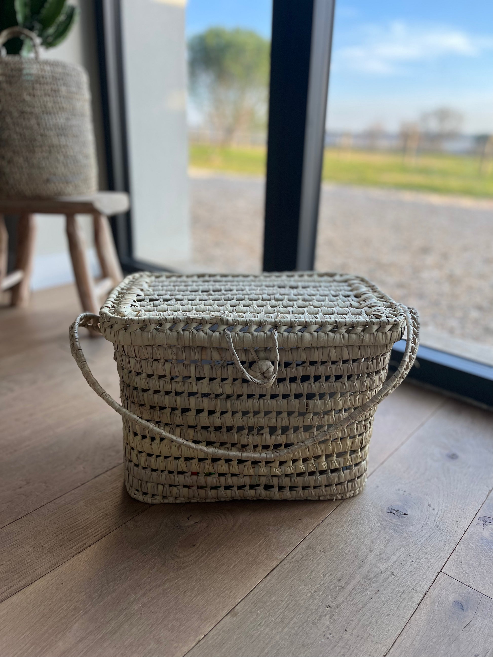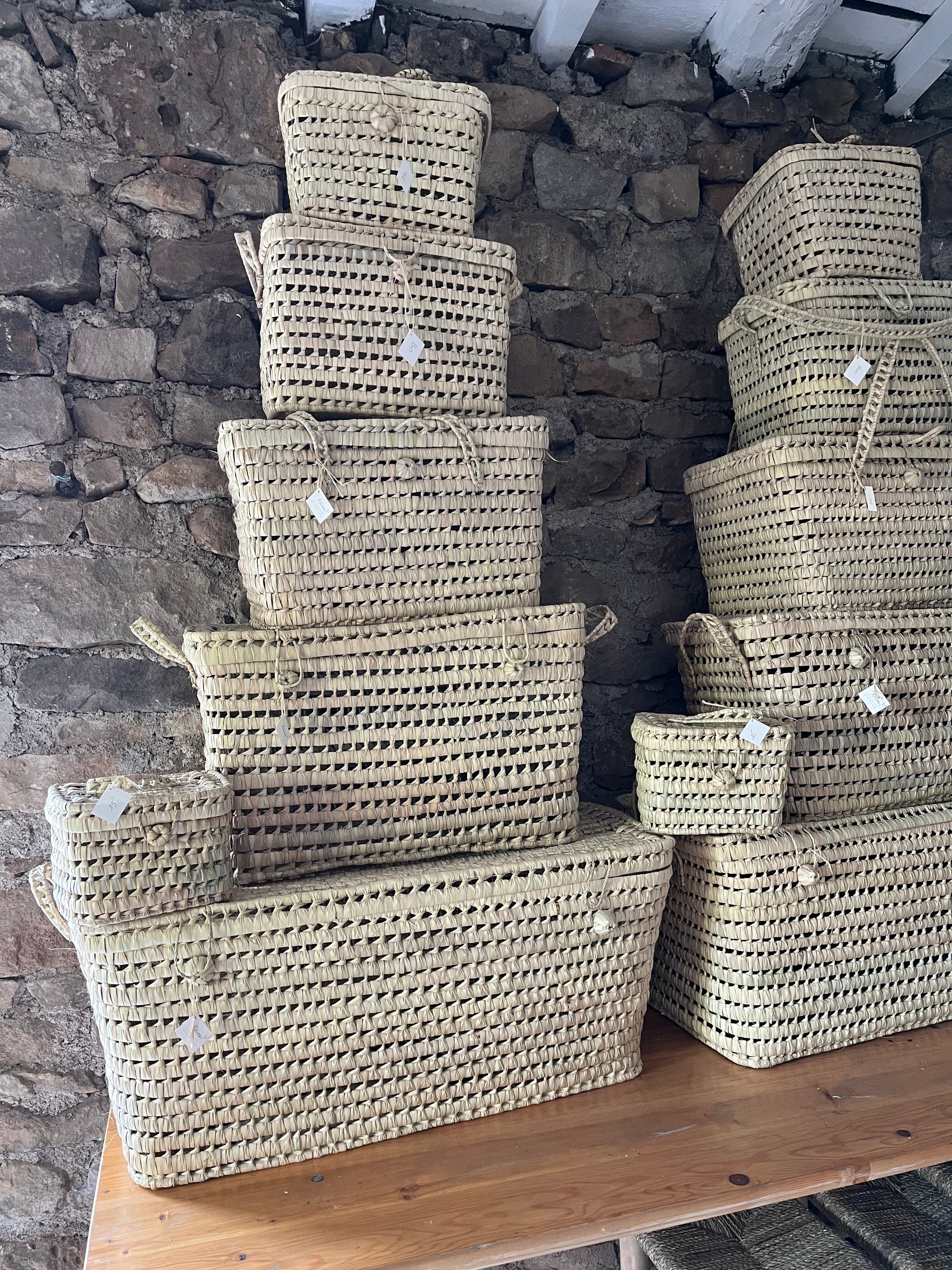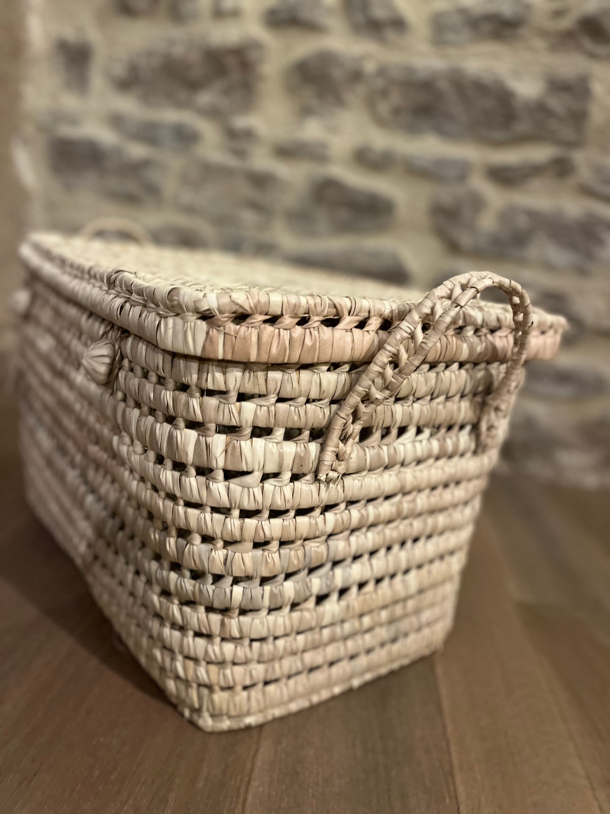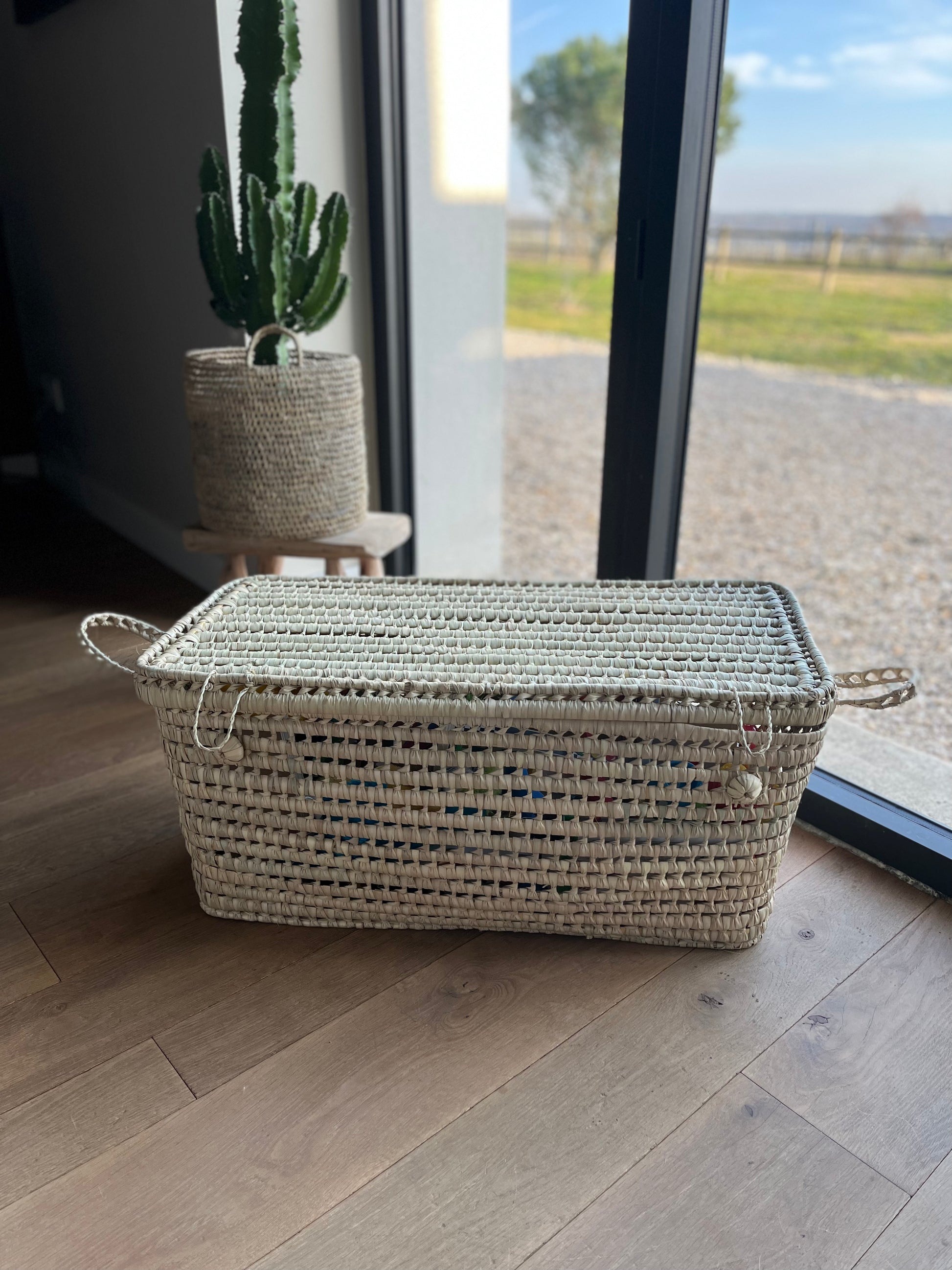 Magnifiques malles en feuilles de palmier naturelles fabriquées par nos artisans marocains. Décoratives et très pratiques pour y ranger toute sorte de petits objets. Le modèle est différent selon les tailles, spécifiquement au niveau des anses.