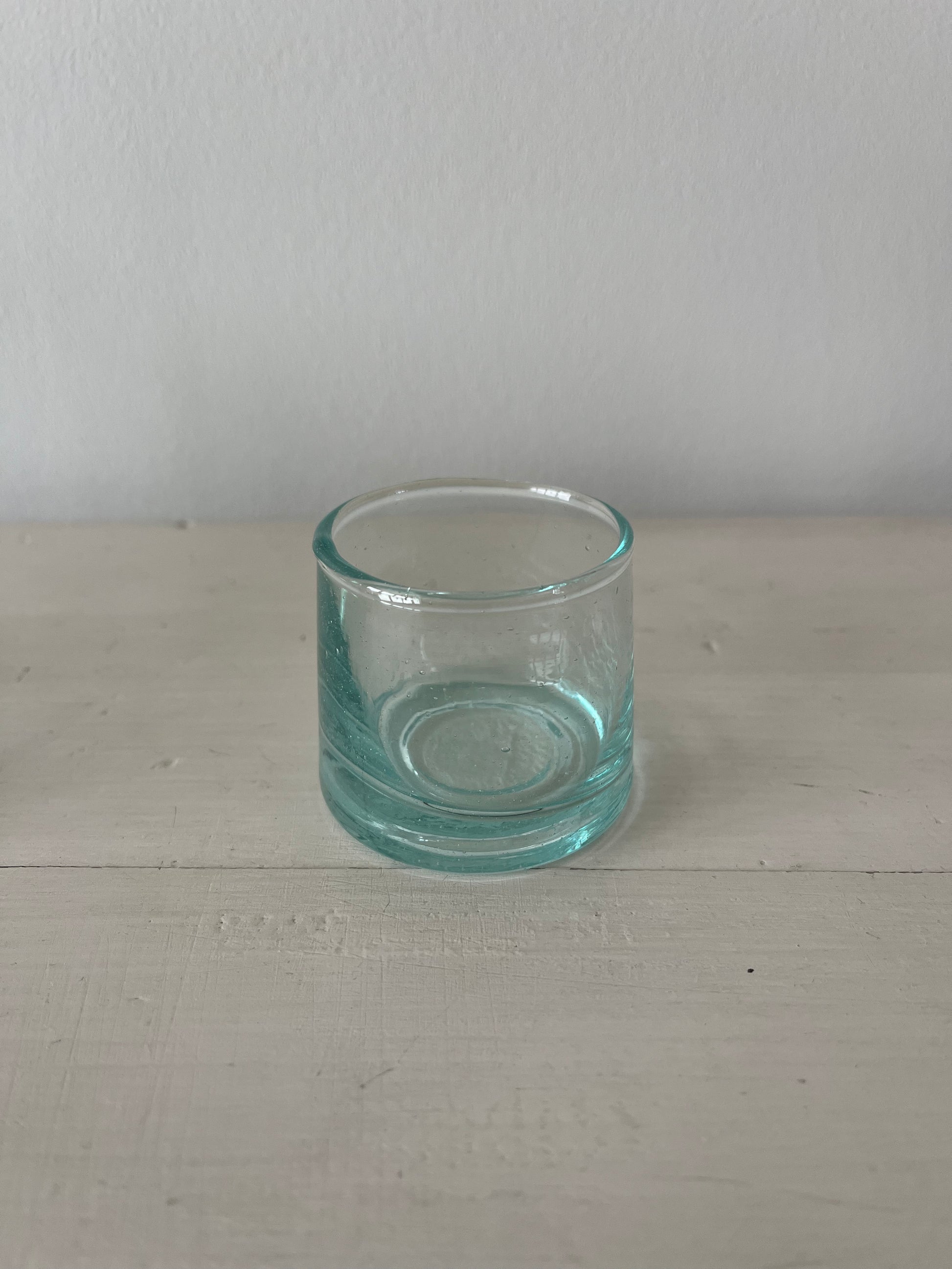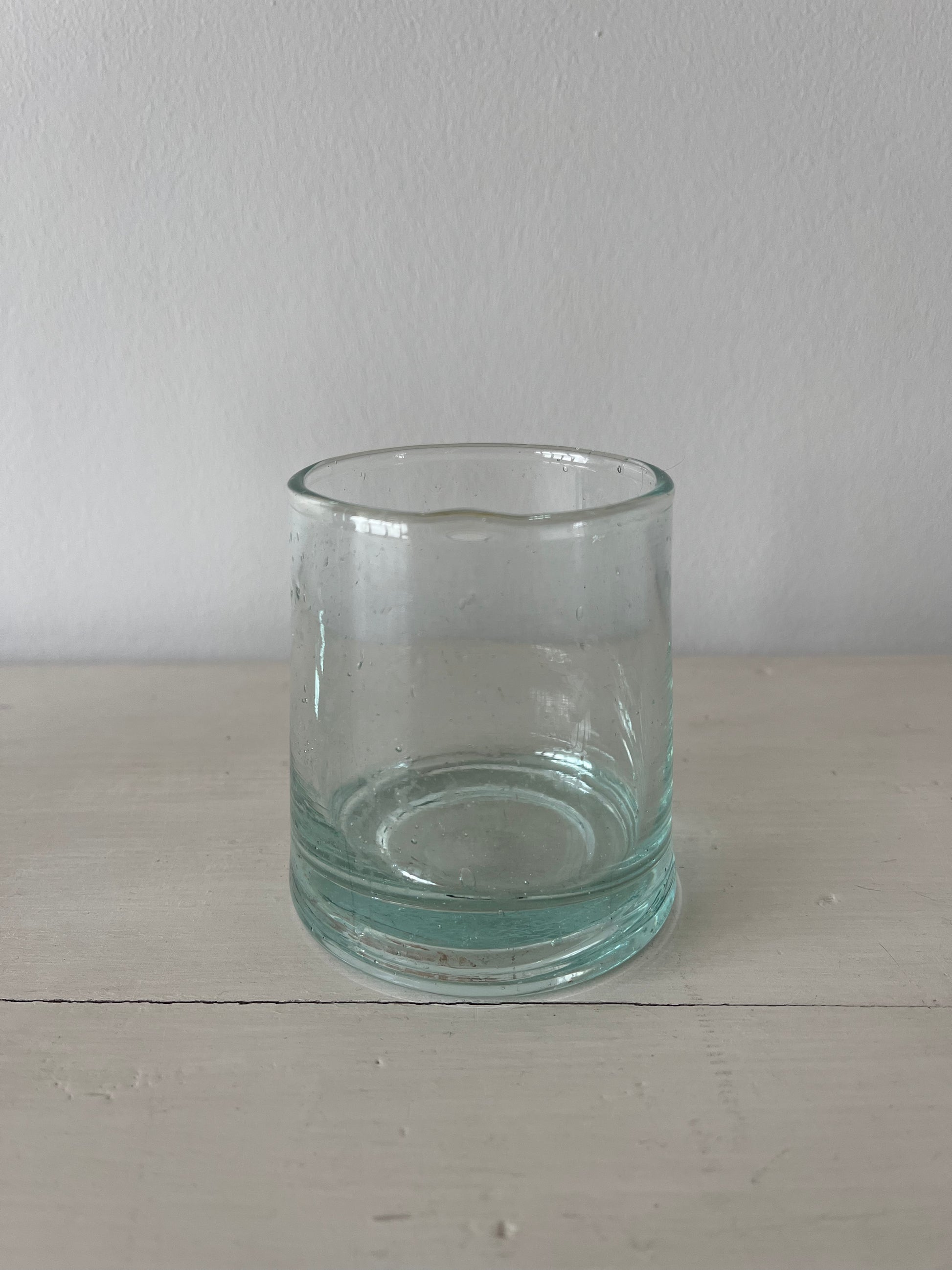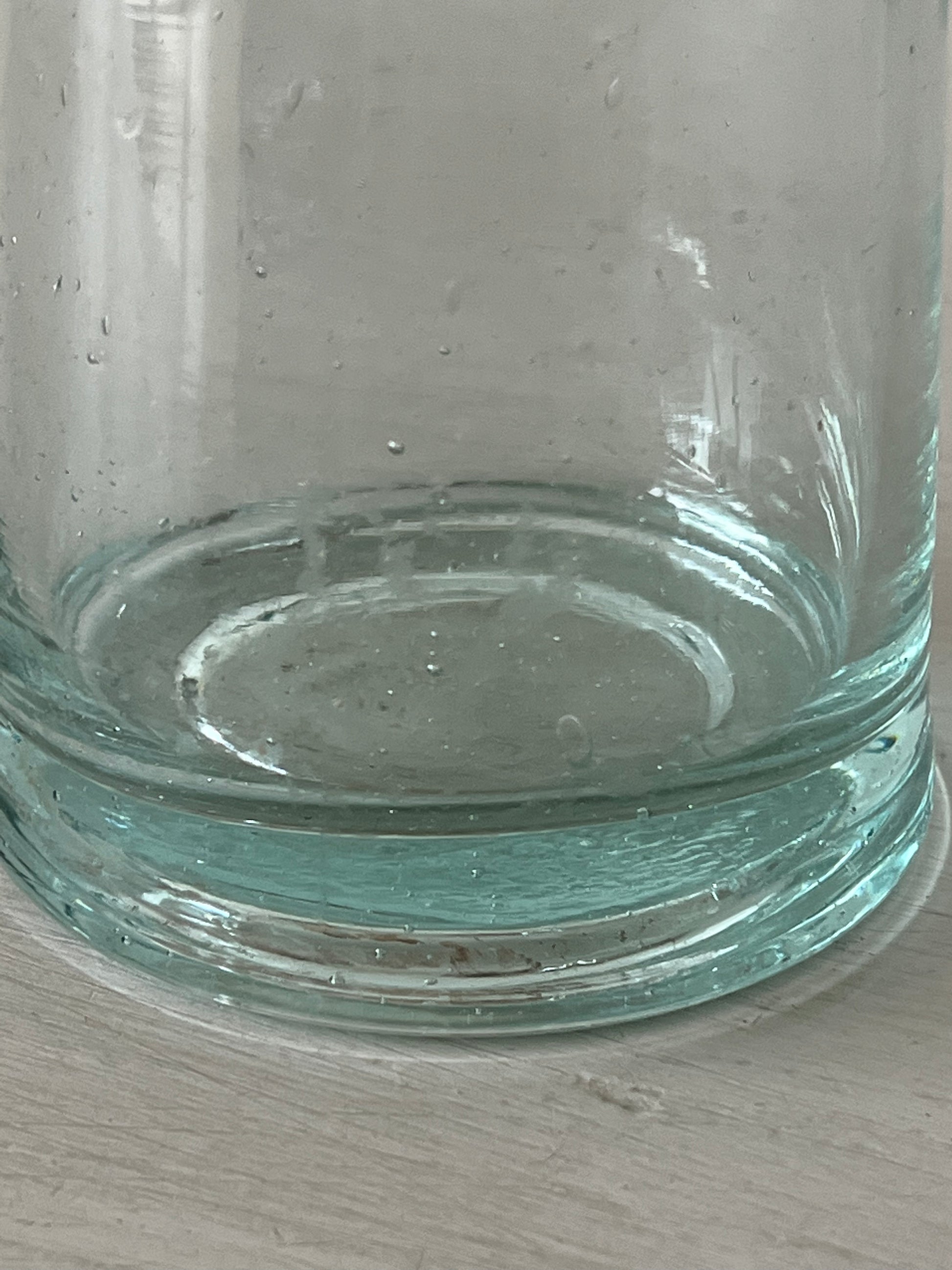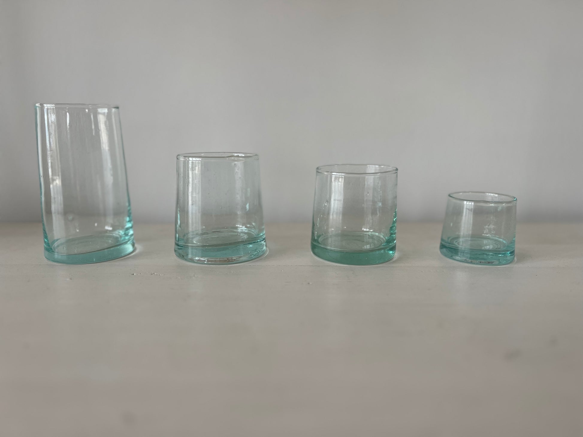 Verres de table soufflés à la bouche à partir de verre naturel ou recyclé.
